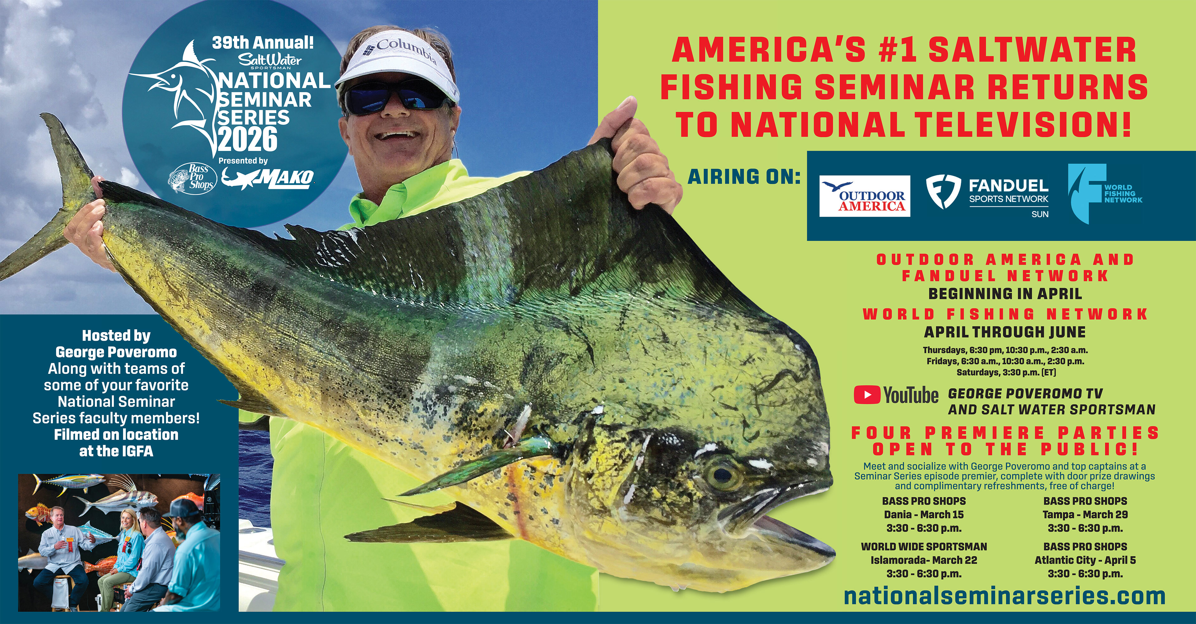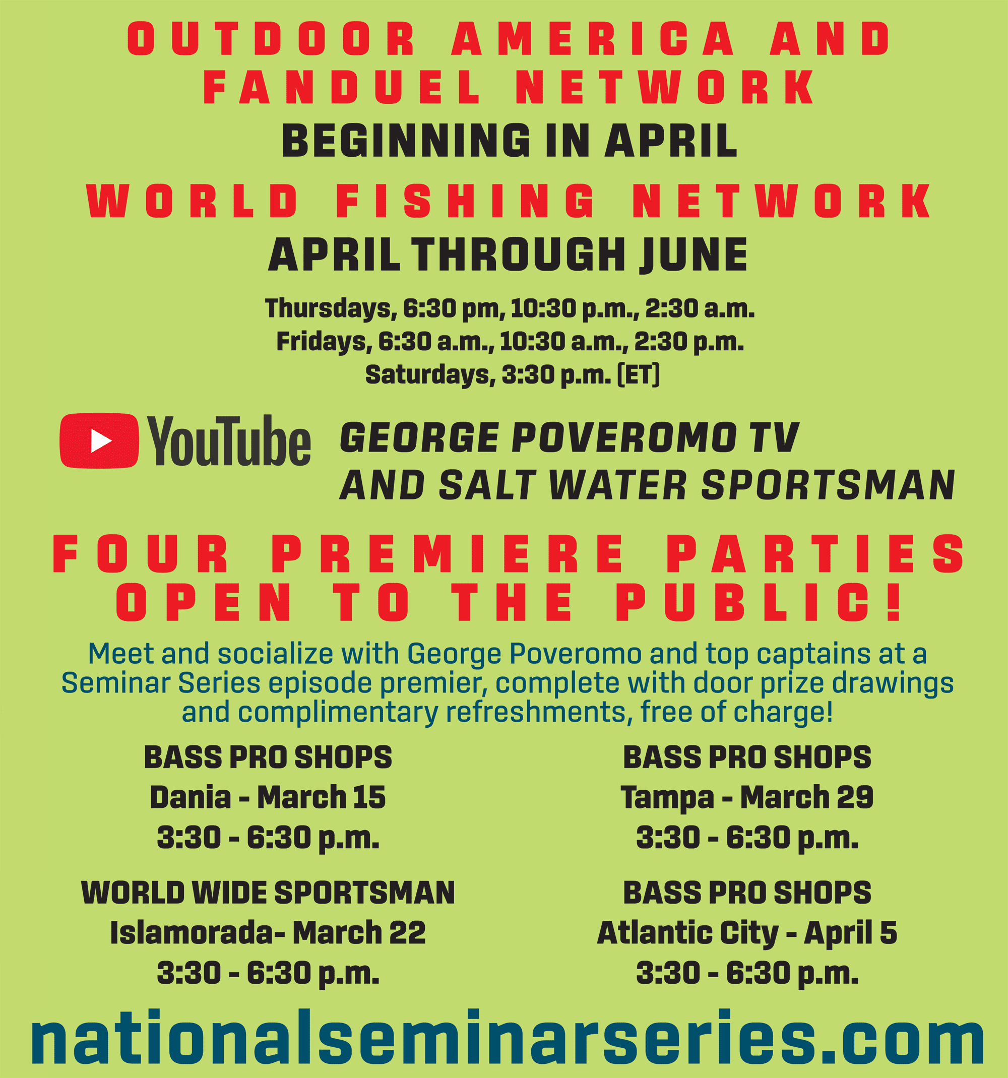 After Seminar Parties, from 3:30 – 6:00 p.m., at the local Bass Pro Shops! (selected locations)